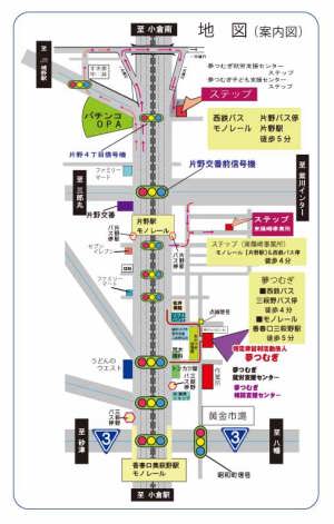 JR小倉駅よりモノレールが出ております。 モノレールで3つ目の駅、香春口三萩野で下車してください。南側の改作口を出てまっすぐお進みください。まっすぐ進まれますと、荒木眼科の看板が見えてまいります。荒木眼科の所を右折して次の4差路を左折してください。左にあかつき幼稚園の正面玄関があります。その向かい側に事務所があります。